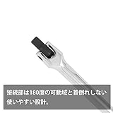 スピンナーハンドルはラチェットハンドルよりもハンドル部が長くなっているソケットハンドルです。ラチェットハンドルのような回転方向調整機能を搭載していませんが、スピンナーハンドル先端部には180度の首ふりが可能なドライブ角が取り付けられています。長いハンドルで効率的に強い力を掛けることができるメリットや、エクステンションと組み合わせることで狭い部分の作業性アップにもつながる便利な工具です。